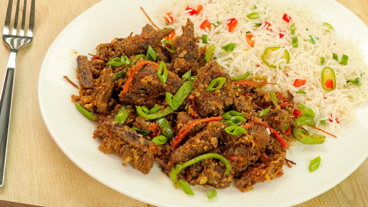 Tender beef strips sautéed with bold chilies, bell peppers, and onions for a spicy, flavorful dish.